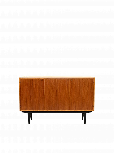 Sideboard of vintage 1960s Nordic manufacture. Externally, the sideboard is perfectly symmetrical thanks to the three lockable hinged doors. Internally there are two compartments, one equipped with shelves and the other with a shelf and two drawers. The black-painted wooden legs lend uniqueness and character to the cabinet. Good condition. A conservative restoration with products of natural origin has been carried out. It may show some signs of aging. Please pay attention to the photographs.