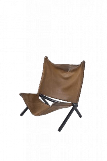 Brown leather armchair designed by Titina Ammanati and Giampiero Vitelli in the 1960s and produced by Brunati, Italy. The armchair has a load-bearing structure in black painted iron. There are four legs, the two rear ones are recumbent and are joined by a tubular bar made of the same curved material, which gives the seat its shape. The two front legs are also highly reclined. The seat is made of beautiful brown leather, original of the period. The backrest is very high and is attached to the frame because from the legs rise two tubular structures, on both sides, inside which the backrest, also made of leather, fits. The armchair has the particularity of being foldable. The armchair is very beautiful and is suitable for vintage settings. Slight wear and patina consistent with age and use, some scratches.