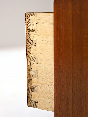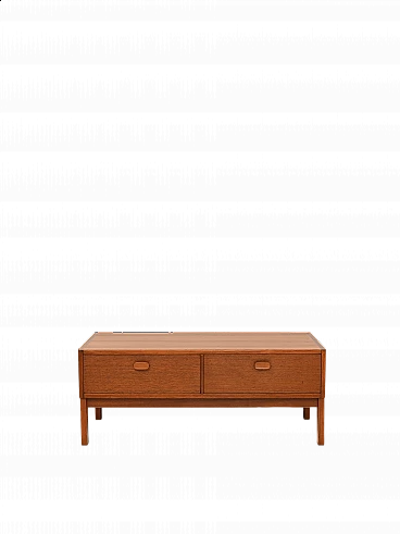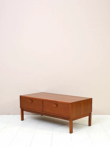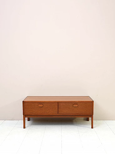 Low cabinet with drawers made of teak wood, manufactured by the Swedish company Ulferts. This piece of furniture from the 1960s features a large shelf and two spacious drawers. The dovetail work and the wooden handle of the drawers recall the quality of Scandinavian design. Good condition. Conservative restoration with natural products has been carried out. May show signs of ageing. Please pay attention to the photos.
