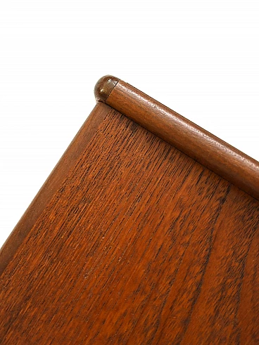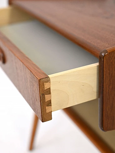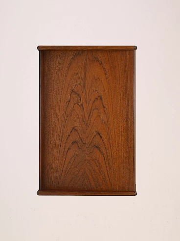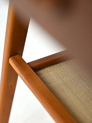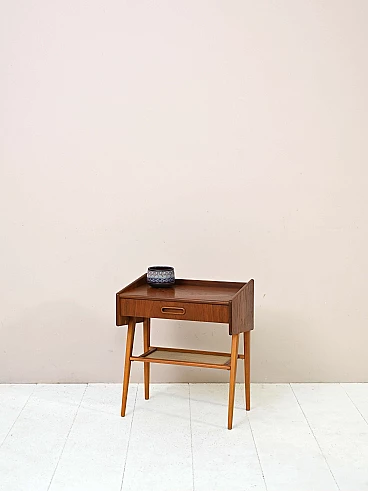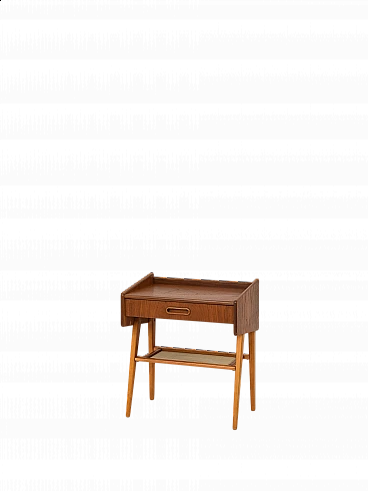 Teak and birch bedside table with rattan magazine rack shelf, 1960s.