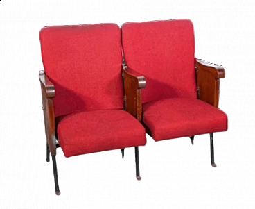 Two-seater wooden cinema bench with liftable seat. Bentwood, plywood, padding and upholstery. It shows normal traces of time and use, in particular light marks on the wood. The upholstery needs to be washed.