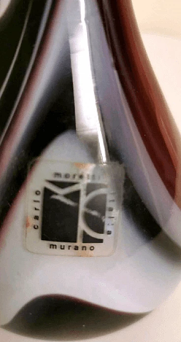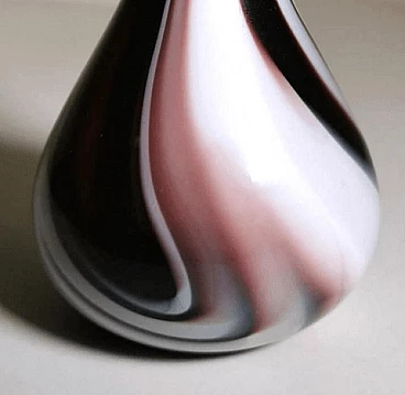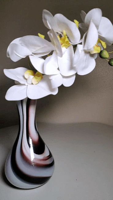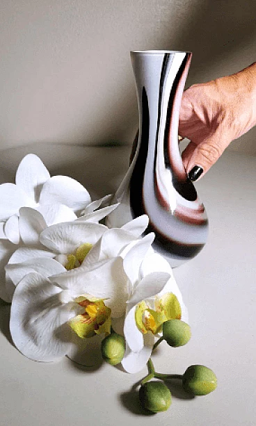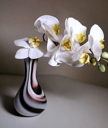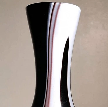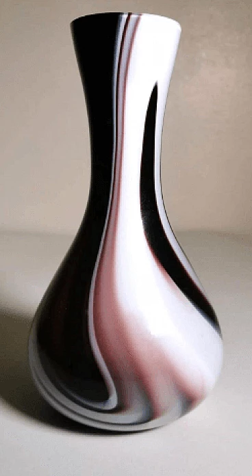 Flower vase with a simple and linear shape in colored opaline glass made between 1970 and 1975. It was blown in a single piece without joints, then modeled with skill by skilled craftsmen in the Murano artisan furnace owned by Carlo Moretti. The most difficult and particular operation is to leave the opaline white inside and create the outside with decorations of another colour: to do this, metal oxides are added to obtain the different colors when the outline of the opal white vase has already come out of the kiln; at the precise moment in which the oxides begin to melt and mix with the white, the craftsman begins the blowing and modeling of the vase, quickly and rapidly, so that the color is distributed only on the surface of the object without penetrating it, as if they were brushstrokes. Once this is finished, the vase is put back in the oven for a very short time and then it is quickly cooled; an operation that not everyone is able to do, in fact it is only delegated to master glassmakers. The company was founded by Carlo Moretti with his brother Giovanni in 1958 in Murano. Here the two materialize the infinite forms of glass in refined design objects; ahead of their time, they always innovate and begin to contaminate glass with the power of colour. Over time, the two brothers increasingly infringed their roles in the company: Carlo mainly deals with design and production, while Giovanni with communication and market strategies. They have been able to reinvent the design of Murano glass, foreseeing changes in taste over time and guiding them through the needs of the market, renewing production processes that have become cumbersome and continuously imagining communication strategies aimed at the intelligent internationalization of the island's production. Carlo Moretti said: "Only in appearance does the world of glass convey an idea of great flexibility because it never stands still, it moves and expands, but then, if you get to know it well, it has great limits. That's why one enters the factory with an idea but he comes up with another one. And this is why Moretti was born as an art factory, where the skill of the master and the production processes count a lot. Glass is rebellious, it cannot be tamed, it is a material in continuous transformation, it has its rules, must be supported at all stages of the process". What may seem like small defects inside or outside the glass (bubbles, lumps, streaks, etc.) are instead proof of the craftsmanship behind the object.