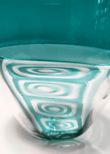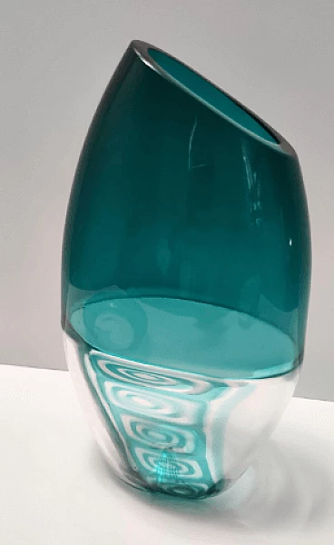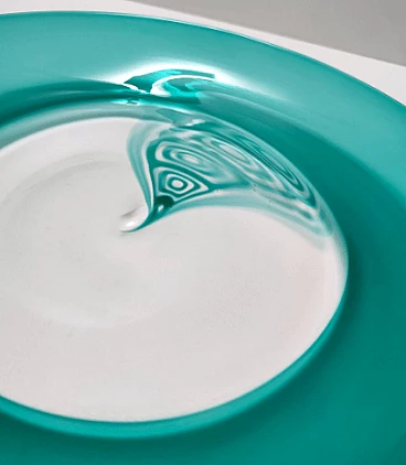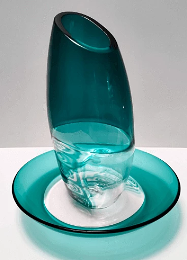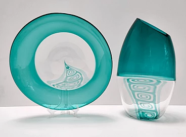 Murano glass vase and plate by La Murrina, 1970s-1980s. Transparent and teal glass with murrine inclusions. The vase is 36 cm high, 19 cm wide and 10.5 cm deep. The plate is 6 cm high and has a diameter of 33 cm.