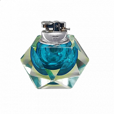Gorgeous blue and yellow submerged Murano glass table lighter by Flavio Poli for Seguso, 1960s. Made in Italy. The item is in excellent condition and works perfectly. Dimensions: cm 12 x cm 12 x cm 10 H.