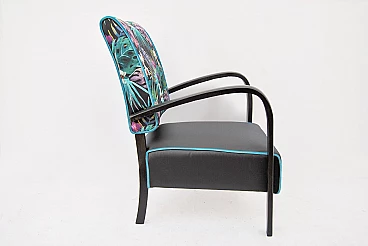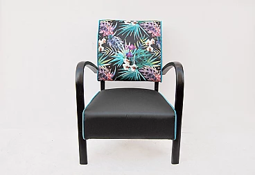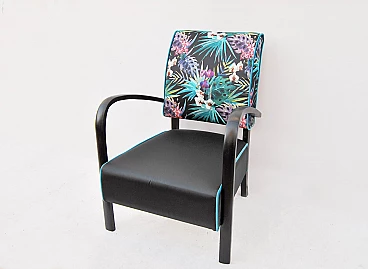 This delightful armchair dates from the 1950s. It has a wooden frame and has been restored and reinterpreted by our staff. The armrests and back legs have been painted with black water-based enamel. New upholstery and cover in fine black and floral patterned fabric with blue borders.