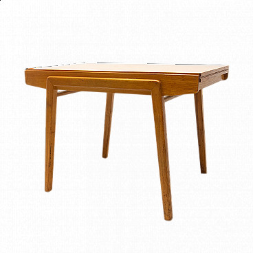 This adjustable dining table was designed by Bohumil Landsman and produced by the company Jitona in the former Czechoslovakia in the 1970s. It is made of ash and beech wood. The length is adjustable from 108 cm to 140 cm. The table is in excellent condition, showing slight signs of age and use. Height: 77 cm, length: 108 cm, depth: 77 cm, unfolded: 140 x 108 cm.