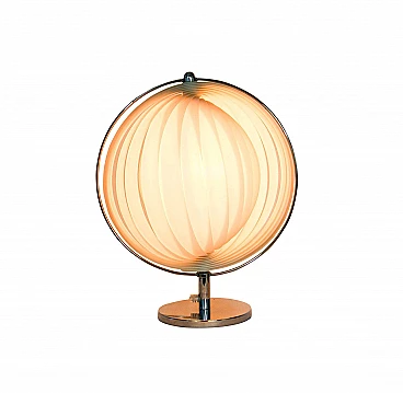 1980s Kare Spain moon lamp. A Verner Panton design for Louis Poulsen. Made of plastic slats, arranged in concentric circles, on a pivotal chrome sphere. The slats can be rearranged to represent the shapes of the moon at various lunar intervals. The slats also serve as reflectors to either expose or hide the bulb. The lamp gives off the most beautiful light when lit. The colour is white. The lamp could benefit from the use of coloured bulb. A great design echoing the 1960s atomic era. In excellent vintage condition some signs commensurate with age. Please see images as they form part of the description. Fitted with a standard European 2 prong plug head and on/off switch. Uses E26 bulb. Height-38cm x Width-32cm