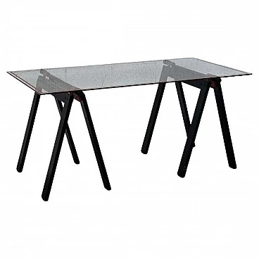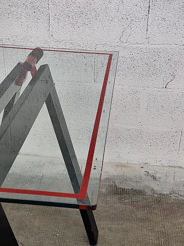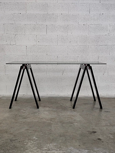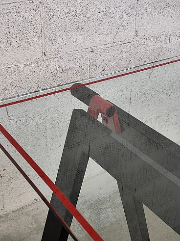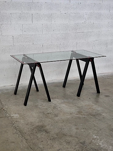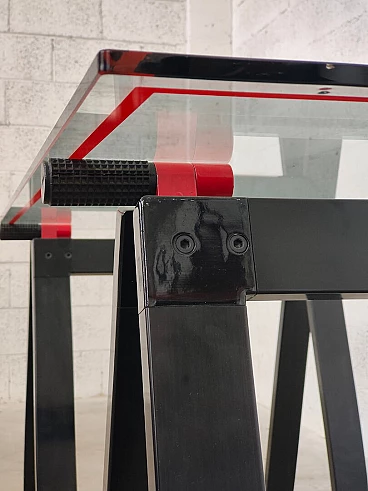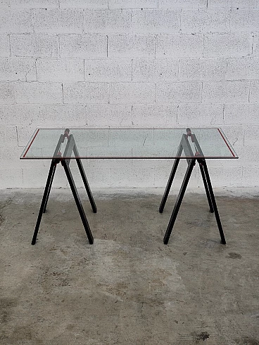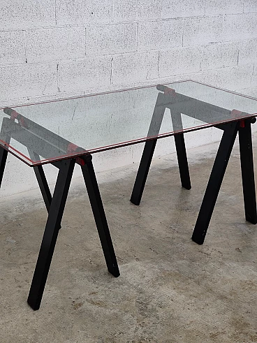 Gaetano work table by Gae Aulenti for Zanotta has an original glass top supported by two folding trestles in black and red enamelled metal. A timeless object. With its dry and essential design, it combines modernity and elegance. It can be placed in many different contexts, from domestic to professional, and in each of them it stands out for its personality and refinement. Gae Aulenti, pseudonym of Gaetana Emilia Aulenti (1927 - 2012), was an Italian designer and architect, particularly dedicated to the theme of architectural design and restoration. Considered one of the best architects of her generation, she left an indelible mark on the history of international design. During her long career, she has won numerous awards, including the prestigious Imperial Prize for Architecture awarded by the Japan Art Association in Tokyo. She graduated in architecture from the Milan Polytechnic in 1953, where she also qualified as a professional architect. Gae Aulenti trained as an architect in the Milan of the 1950s, where Italian architecture was engaged in the historical and cultural quest for the recovery of the architectural values of the past and the existing built environment that would flow into the Neoliberty movement. Aulenti was part of this trend, at odds with rationalism.