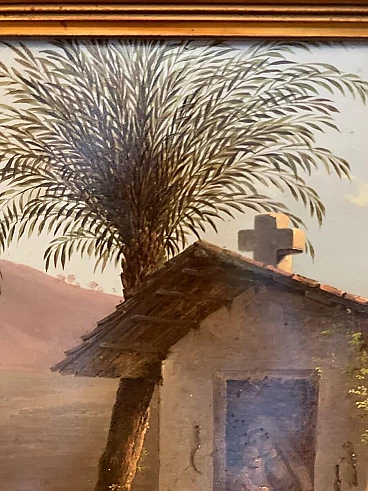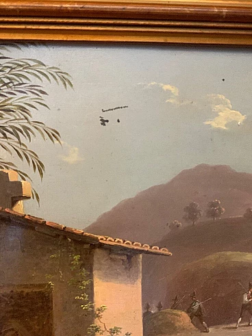 Typical technique of foreign and German traveling painters: oil on metal plate, probably of zinc, repainted in red to make it look like very fine copper. The painting depicts a scene of an assault by the pontifical dragons against the Ciociari brigands. The various sketches inside the painting first show us the misdeeds of the brigands and a subsequent arrival of the troops.
