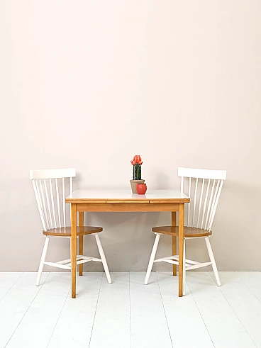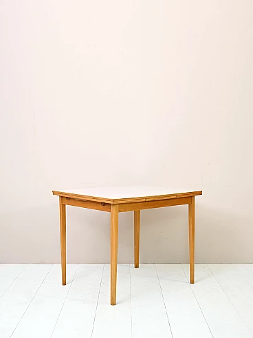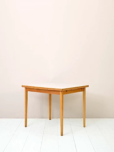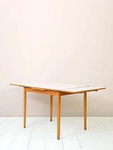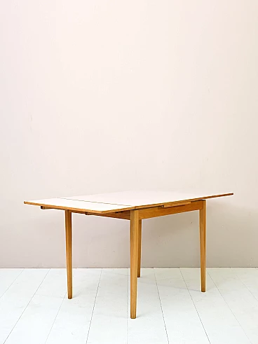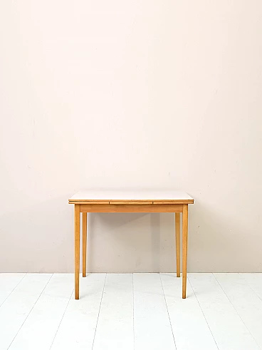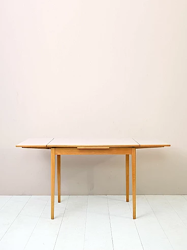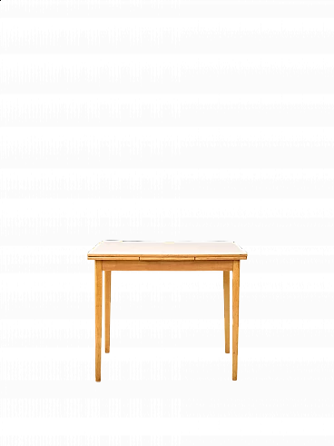 1960s dining table with pull-out extensions. The formica top makes this piece of furniture with its typical mid-century design special. The possibility of being extended makes it ideal for a small kitchen or dining room. Good condition. It has been restored to its original beauty. Please pay attention to the photos. Dimensions of table open: W 140cm, H 74cm, D 75cm. Dimensions of table closed: W 90cm, H 74cm, D 75cm.