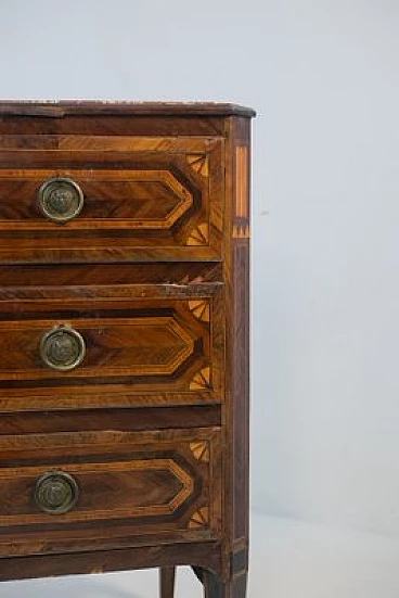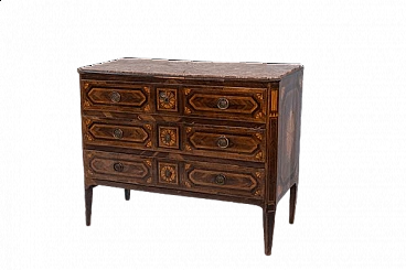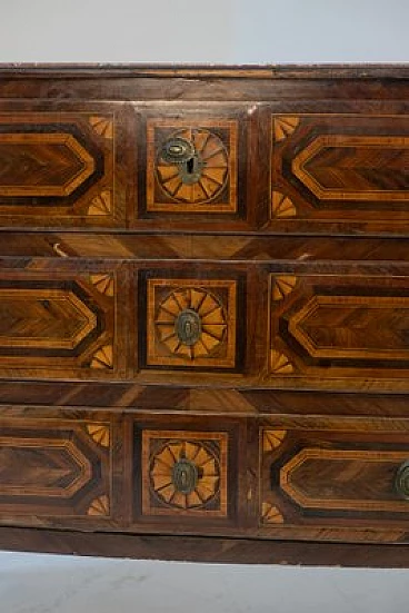 On the front of the chest of drawers we see 3 large wooden drawers, as long as the entire body of the product. The three drawers appear to be divided into two smaller ones, but this is an optical illusion created by the wonderful woodwork, which makes it look like something that does not actually exist. Centrally to each drawer we see a brass lock in patina, with an attached key. The inside of the drawers is lined in a very antique, beautiful and elegant floral paper, suitable for the cabinet in which it is applied. Around each lock a round element has been recreated through the use of different colours of wood and workmanship.