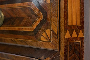 The chest of drawers at the corners is not angular, but is carved to give a bevelled effect, and it too is decorated differently from everything else: with light-coloured inverted triangles and architectural bands. The background that homogenizes everything is created by the effect of the wood: in fact, wooden bands have been interwoven, with different grains clearly visible and elegant.