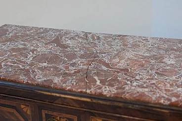 The chest of drawers has a very hard and classic rectangular shape, there are 4 wooden punched support legs, very elegant. The top is made entirely of a very elegant and sumptuous red marble from France, but has a central crack, being a VINTAGE product.