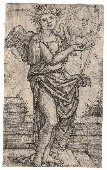Splendid allegory of Christianity is a thriving winged woman crushing a snake. In her hands he holds a slender cross like a scepter and a fiery heart on which an anthropomorphic sun rests. Spikes protrude from her crowned head. It differs from the original because it is visible the brick division in the wall in the background and the presence of tufts of grass in the upper left step. Good specimen well contrasted but slightly evanescent. Visible impression on the reverse of the sheet. Specimen trimmed inside the subject, on the reverse traces of old assembly, restorations at the four corners. On the reverse stamp (Lught 86) from the Alessandro Castagnari collection (Rome 1881-1940), a well-known merchant active in Rome, his stamp can be found on prints and drawings. In 1927 at Ulrico Hoepli in Milan a sale of sheets with this stamp was made.