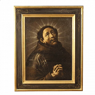 Antique Italian painting from the 18th century. Oil-on-canvas work depicting sacred art subject St. Francis in Ecstasy of excellent painterly hand. Modern lacquered, gilded and painted wooden frame of beautiful decoration. Painting that has undergone conservative restoration and rintelo during the 20th century. Work for antiquarians and collectors in good state of preservation. Light painted H 56 x W 41 cm.