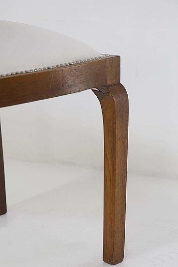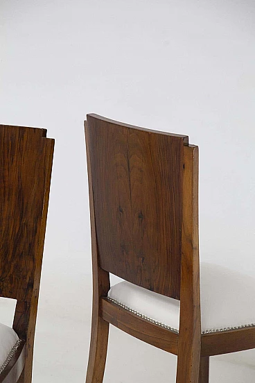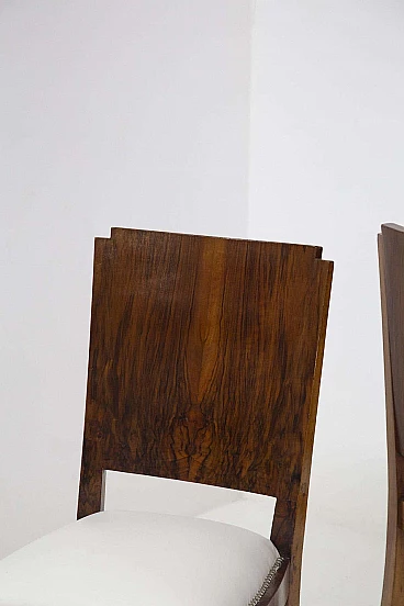 Pair of wooden chairs designed and produced in the 1920s by a fine Italian manufacturer. The chairs have a supporting frame made entirely of light walnut wood, which is very well preserved. The supporting legs are 4 and have a square shape, which curves under the seat attachment, giving a unique comfort. The seat has been entirely upholstered with a very elegant white cotton fabric, which creates a wonderful contrast to the dark wood. The fabric has been punched with very elegant iron nails. The backrest is very elegant; it follows the legs up to just above the seat, and then becomes a single block of wood, offering unprecedented comfort. The high corners create a small geometric scaling, simply refined. These chairs are suitable for dining areas, but also for offices as chairs for clients.