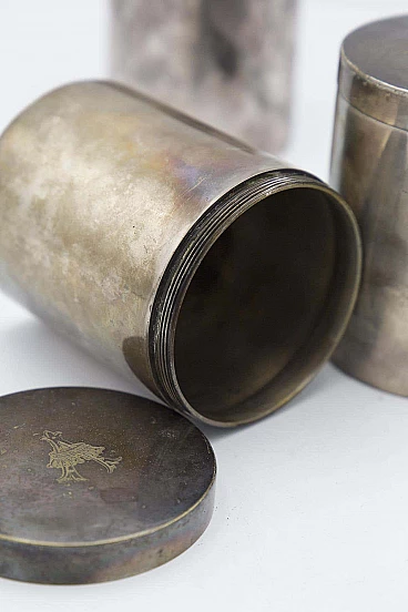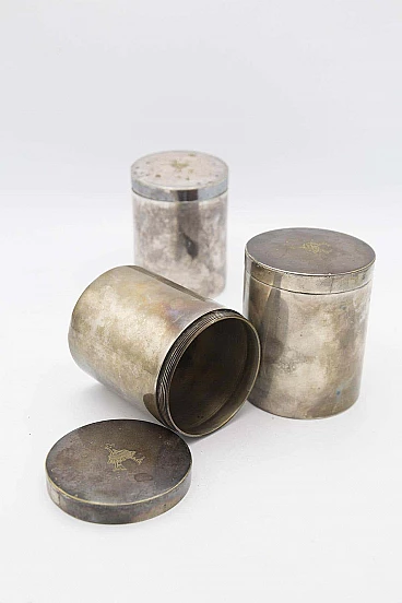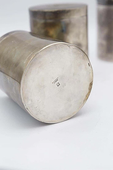 Beautiful antique triptych of silver jars or vases stamped with the stamp of Boin Taburet of Paris, a very famous and valuable French silver manufactory of the 20th century. The jars are exactly identical and have a cylindrical shape with a flat base and top. All have a cap that can be opened by unscrewing it. All are marked on the base, while the cap in the centre bears the manufacture's coat of arms. These vases are suitable as holders, but also as planters for small plants. They are very rare decorative objects. Wear consistent with age and use. The set is in good original period condition, with minor scratches.
