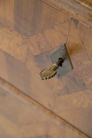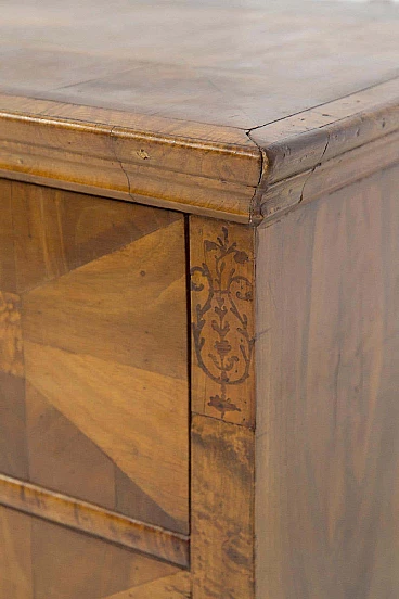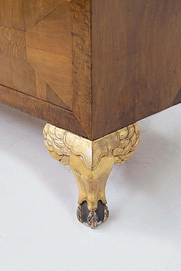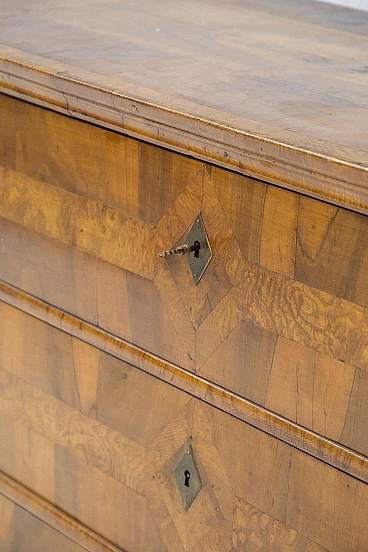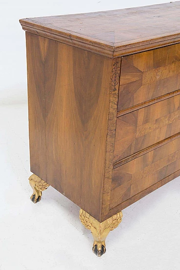 Splendid wooden chest of drawers from the Bidermaier period in the Austro-Hungarian Empire, around 1850. Biedermeier was an artistic and ornamental movement that developed in the historical period between 1815 and 1848. Very popular among the German and Austrian bourgeoisie, it is often referred to as the 'romantic' genre. The chest of drawers has four beautiful brass feet, which seem to have very sinuous wings and three claws at the end. At the front are three large horizontal drawers that cover the entire length of the dresser. Each drawer has a brass lock in perfect patina, with an attached key that opens all the locks. The shape is rectangular and quite rigid. The strong point is the wood, which is very light and valuable. Its workmanship is marvellous: in fact, around the locks we see a rhombus that frames them; connected to this rhombus are two thinner horizontal bands, with a different workmanship inlaid in the wood. The frame of the chests of drawers also presents a different motif, all decorated with sinuous fretwork. The chest of drawers is evidence of a great piece of history, of a vanished empire. Wear consistent with age and use. Slight discolouration. The chest of drawers is in good original period condition, with slight scratches.