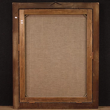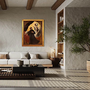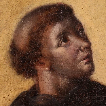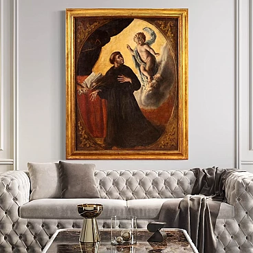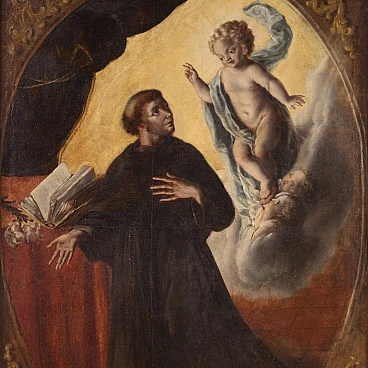 Antique Italian painting from the 18th century. Oil on canvas work depicting religious subject St. Anthony of Padua and the infant Jesus of good painterly hand. Exceptional size painting adorned with antique wooden frame, not contemporary, carved and gilded with some signs of time. Work painted within an oval, on canvas and rectangular frame (see photo). Corners of picture nicely painted with decorations (see photo), saint depicted in center of scene with lily, symbol of purity, at his side. Baby Jesus depicted at upper right with winged cherubs at his feet (see photo). Work of good luminosity, ideal for inclusion in an important salon or study, for antiquarians and interior decorators. Painting that has undergone conservation restoration, rintelo, frame replacement and color restoration in several places (see photo). In good condition and in beautiful patina. Light painting H 144.5 x W 112.5 cm.