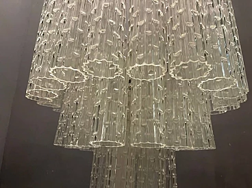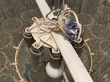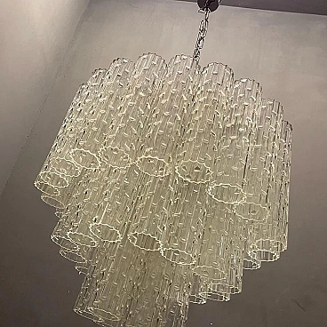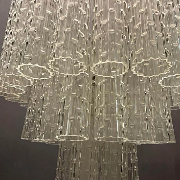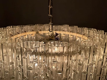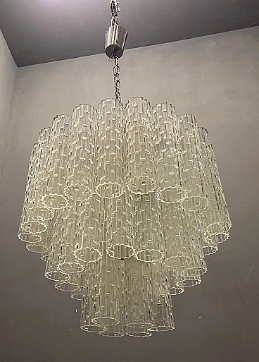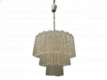 Transparent blown glass chandelier, 1970s. It consists of forty-two cylindrical glass elements mounted on a metal structure. It requires eight E14 bulbs. Rewired and compatible with Europe, UK and USA. Height without chain: 54 cm. Total height with chain: 118 cm.