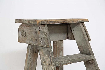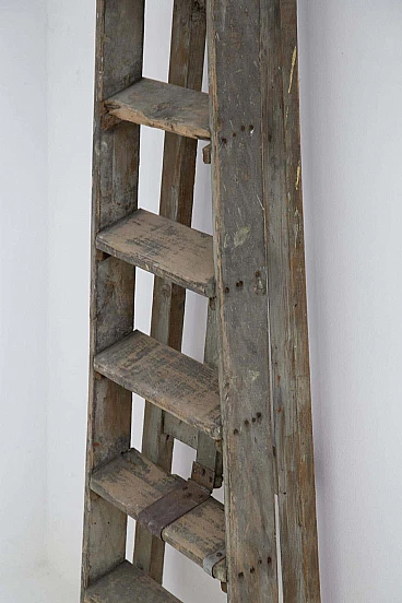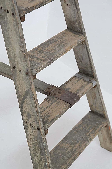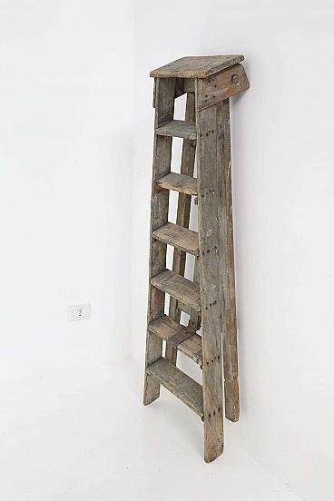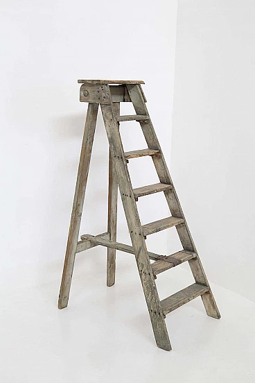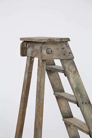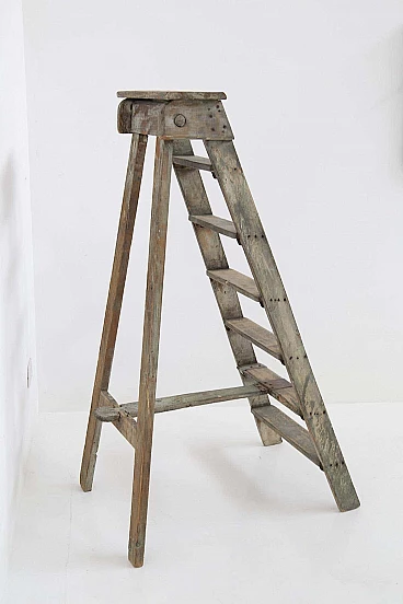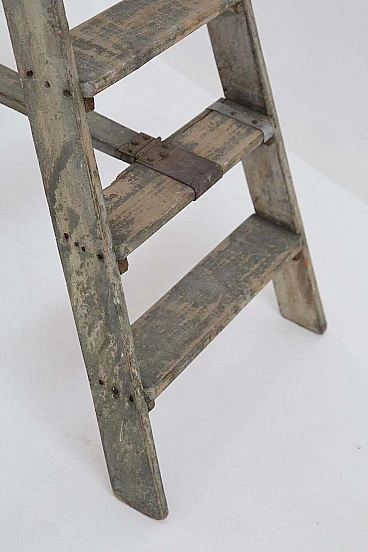 Vintage Italian rustic staircase dating from the 1920s. The ladder is made of wood. The staircase is a beautiful painted wooden decorative element from the Rustic Chic period of the early 1920s, made in Italy. It can also be associated with the Fané style. It is made entirely of durable wood, stained in shades of grey. The ladder opens by means of a mechanism to facilitate climbing. The ladder can serve as a splendid decorative element, typical and suitable for an industrial or rustic style, for living rooms or gardens. Dimensions closed: depth 20 cm, height 152 cm, width 52 cm. Wear consistent with age and use. In original condition. The ladder is not very safe, recommended for decorative beauty only. It has flaws.