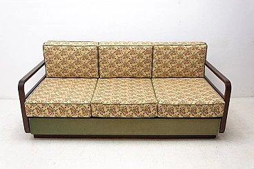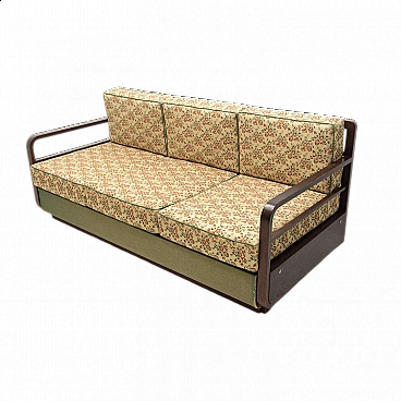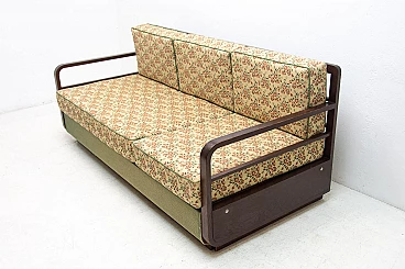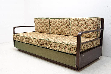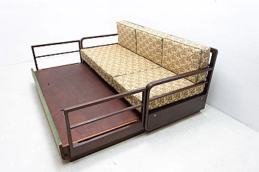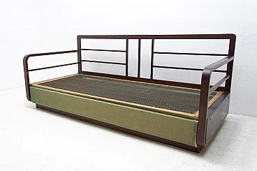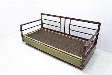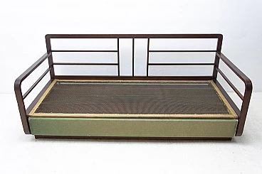 Art Deco sofa bed in dark stained oak, made in the former Czechoslovakia in the 1950s. It is necessary to purchase a new mattress. Seat height: 44 cm.