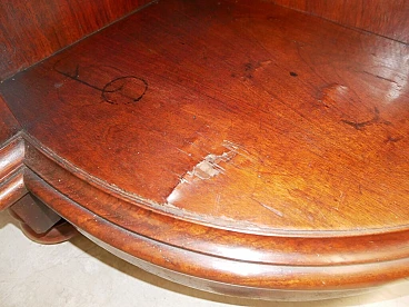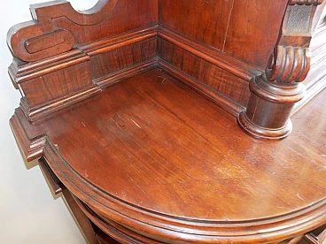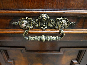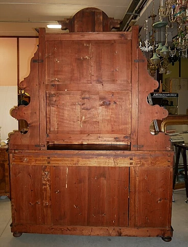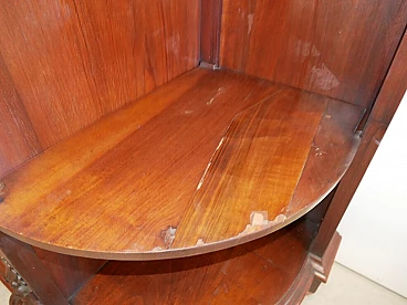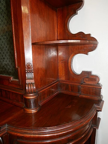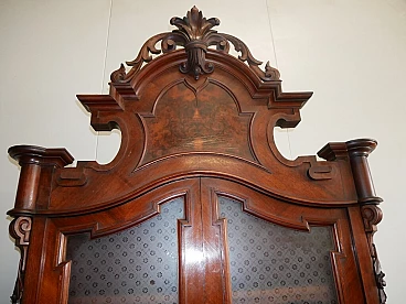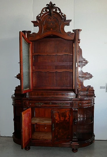 Late 19th century. Northern Italian provenance. Cabinet of excellent cabinet making with solid wood parts, herringbone veneered parts, rooted parts and carved parts. Large dimensions, measures in height with frieze 280 cm, length 75 cm, depth 58 cm. Base unit with central doors, drawer above, rounded sides with open shelves, riser two central glass doors, two shelves inside,