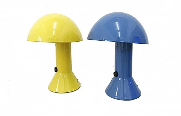 Nice pair of yellow and blue 'Elmetto' table lamps by Martinelli Luce, made in Italy in the 1970s. Painted resin structure with truncated-conical base and semi-spherical adjustable diffuser with white painted aluminum internal screen. The lamps can be can be purchased separately.