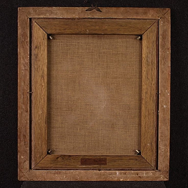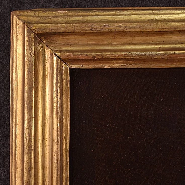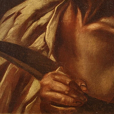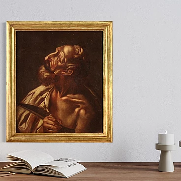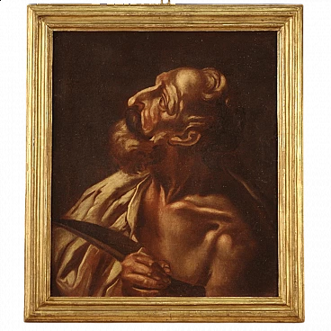 Antique Italian painting from 1100. Oil painting on canvas depicting religious subject St. Bartholomew by an excellent painterly hand. Painting of beautiful size and proportion adorned with antique wooden frame, not contemporary, carved and gilded. Painting depicting the Saint in profile with the knife in his hands, symbol of his martyrdom. A work of great character, with a dark background, characterised by a skilful use of light. Painting that has undergone conservation restoration, re-staining, replacement of the frame and repainting in several places. In good condition. Light painting H 60 x W 51 cm.