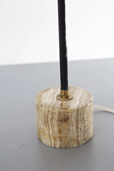 Table lamp of fine Italian manufacture from the 1950s. The lamp has a very elegant cylindrical base made of light marble. The central body is made of black aluminium and brass and allows the base to connect to a central brass bar, which creates two spaces: the one on the right has a decorative brass element in the form of a bell, which is very elegant; the one on the left has a sphere made of shiny white opaline glass. On the horizontal brass bar is a sinuous brass band, which creates gentle waves. A lamp for lovers of the Mid Century and elegant taste.