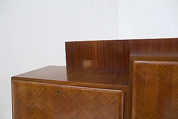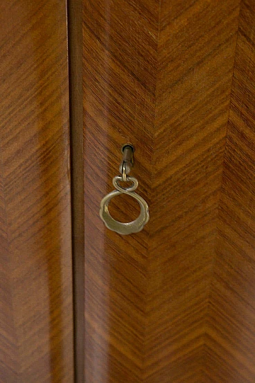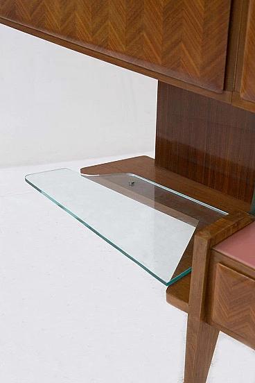 A splendid wooden wall cabinet attributed to the great designer Paolo Buffa in the 1950s, with glass shelves made by Fontana Arte. The piece of furniture has a base supported by six legs in Buffa's style, perforated and rather thick, with an inverted triangular shape. These legs support the rectangular base, which is made entirely of finely worked wood inlaid with the zigzag pattern typical of Buffa. On the base are four small drawers with round brass handles, original of the period, for storing documents or objects. On the left side, at the same height, is an asymmetrically shaped glass shelf, attached to the cabinet by a very elegant wooden frame. The upper part of the base is made of a very elegant and shiny pink glass. On this shelf, between it and the structure above, three glass dividers have been created, positioned vertically to create compartments for the display of some particular object. Above rises the upper structure, consisting of four doors: the two central ones open like windows, using a brass key, original of the time. The right-hand door also opens as a window, using a round brass key in original patina. The left door, on the other hand, has a trapezoidal shape, also carved in inlaid wood and opens as a flap, using a brass key. Inside this door is a small bar, with a very elegant glass shelf. On the far right are three beveled glass shelves, cut according to the asymmetrical shape of the cabinet, creating three clean, very beautiful and elegant display spaces. Both above and below these shelves are two tubular elements in patinated brass, which connect the background (made of the same wood panel) to the sides of the cabinet itself. The sideboard is suitable for high-class bar areas or studios.
