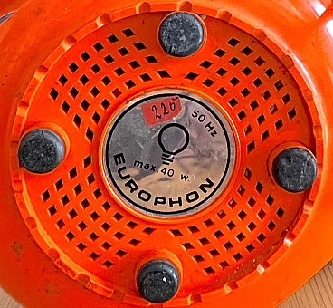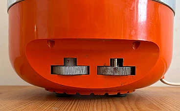Europhon Italia radio lamp, orange color, design Adriano Rampoldi 1970s space age style and in good condition, two buttons for two light intensities. The third button activates the radio (the speaker is inside the lampshade). Since it is OM only, it does not tune any radio stations. I offer it as a space age lamp with ambient light or soft spot light. In bright orange color. On the front, this lamp has 3 buttons: one for AM radio, one for soft light and one for bright light and a headphone connector (not included). On the back has two wheels, one for radio channel and one for radio volume. Made of orange ABS and opal plexiglass. Emblematic lamp of the 1970s that appears in "L'utiopie du Tout Plastique 1960-1973." Good overall condition. E14 screw-in bulb (included).