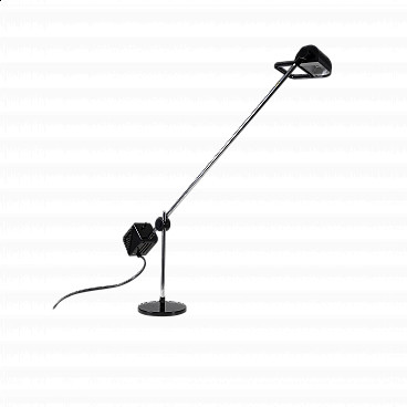 Produced in Italy, 1970s. These lamps have beautiful long chrome-plated arms that can be removed from the base. Both black lacquered bases are marked on the bottom and have a black plastic cap. This model is no longer produced, which makes it difficult to find. The height depends on the orientation of the shade. These lamps are vintage, so they may show slight traces of use, but can be considered to be in very good original condition. Width 84 cm, depth 16 cm, height 61 cm.