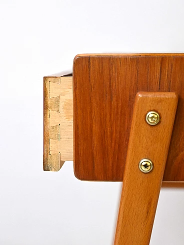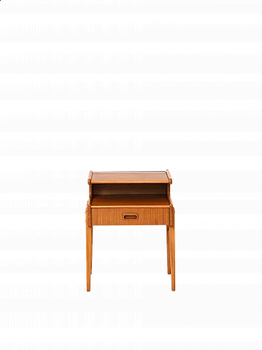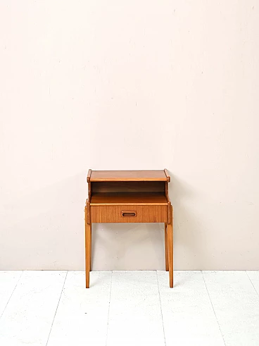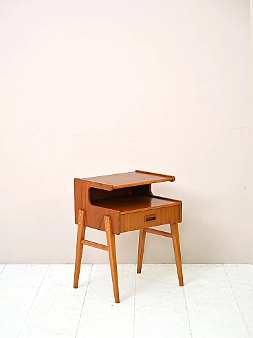 Vintage Scandinavian bedside table. It features a double shelf and a capacious drawer. The long conical legs slender the structure. The warm tone of the wood and the modern design make it a suitable piece of furniture for more contemporary settings. Good condition, conservative restoration with natural products has been carried out. Please pay attention to the photographs.