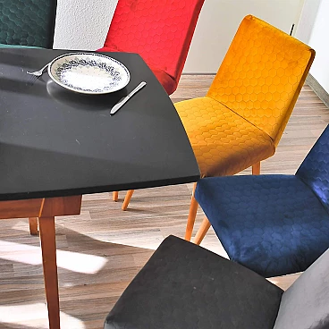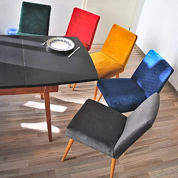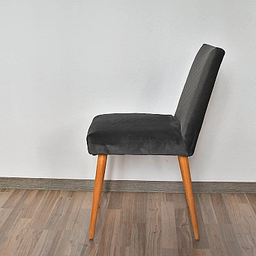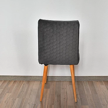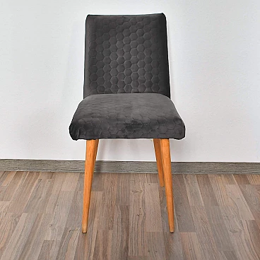 Chair 200-244 was produced at Słupskie Fabryki Mebli in the 1970s. The obtained labels of the model indicate more precisely the period 1974-1976. It is one of the simplest types of upholstered chairs produced in the People's Republic of Poland period in terms of construction. Together with model 1020 B, it is probably SFM's most popular model. The fabric was based on corrugated springs and polyurethane foam. It was thus one of the first upholstered furniture pieces in Poland to use polyurethane foam. Gradually it supplanted the veryprene equivalents and 'porous rubber', which were very comfortable forms of silicone materials. The visible joinery elements were turned and finished with colourless varnish. Made of beech wood with corrugated springs, polyurethane foam and clear varnish. Complete restoration. The beech legs were cleaned, glued back into the chair frame, covered with an alder-coloured stain and finished with a shellac polish. The upholstered part received new padding, all finished with a high-quality quilted fabric. Spring seat. We have five pieces of these chairs available in different colours. Dimensions: height 83 cm; width 43 cm; depth 47 cm; seat height 40 cm.