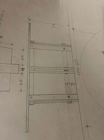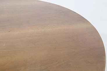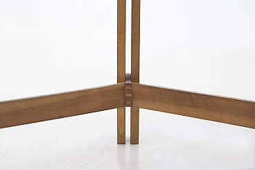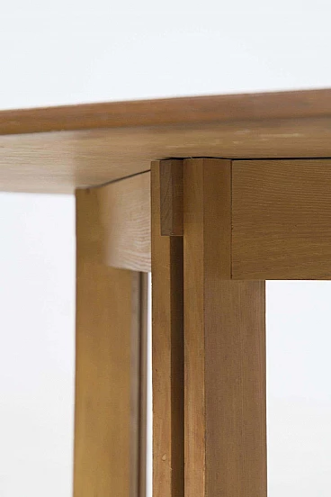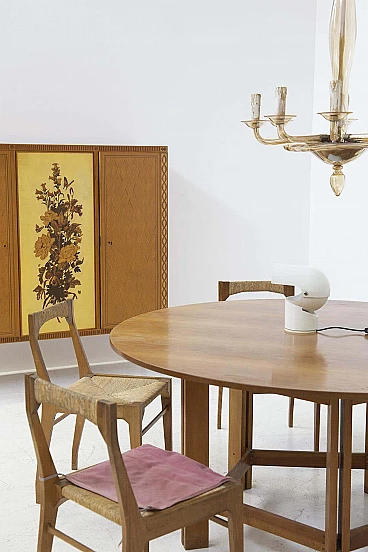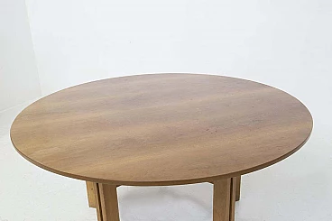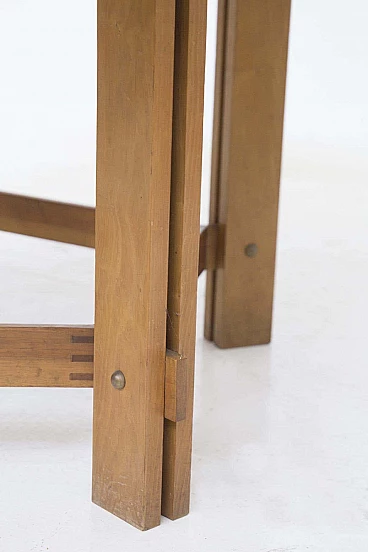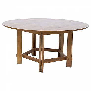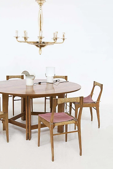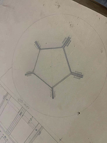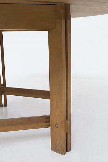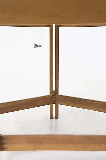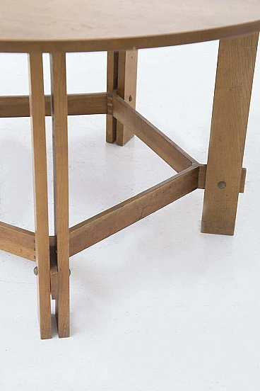 A beautiful round table designed by three great designers Vittorio Gregotti, Lodovico Meneghetti and Giotto Stoppino, of fine Italian manufacture from the 1950s. The table is made entirely of wood with hard, outlined geometric shapes. The table top has a beautiful round shape, with the wood grain evident and very clear, very elegant. Its uniqueness can be seen at the height of the legs: each leg is composed of two structures that link together to create a wonderful interplay of very eclectic geometric shapes. These legs create the geometric figure of a well-defined pentagon; in fact, each leg has a small wooden structure that links them together, defining the perimeter of the shape. The pentagon is also present under the top, although not visible because it is covered. The original design is in our possession, as you can clearly see from the photos. This table is extraordinarily beautiful, suitable as a table centrepiece and perfectly suited to retro but also modern styles.