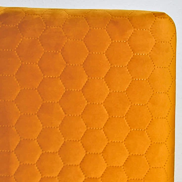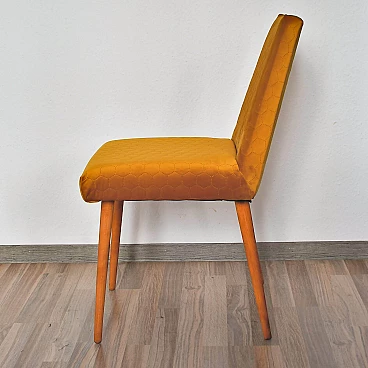 Chair 200-244 was produced at Słupskie Fabryki Mebli in the 1970s. The obtained labels of the model indicate more precisely the period 1974-1976. It is one of the simplest types of upholstered chairs produced in the People's Republic of Poland period in terms of construction. Together with model 1020 B, it is probably SFM's most popular model. The fabric was based on corrugated springs and polyurethane foam. It was therefore one of the first upholstered furniture pieces in Poland to use polyurethane foam. Gradually it supplanted the veryprene equivalents and 'porous rubber', which were very comfortable forms of silicone materials. The visible joinery elements were turned and finished with colourless paint. Made of beech wood with corrugated springs, polyurethane foam and clear varnish. Complete restoration. The beech legs were cleaned, glued back into the chair frame, covered with an alder-coloured stain and finished with a shellac polish. The upholstered part received new padding, all finished with a high-quality quilted fabric. Spring seat. We have five pieces of these chairs available in different colours. Dimensions: height 83 cm; width 43 cm; depth 47 cm; seat height 40 cm.