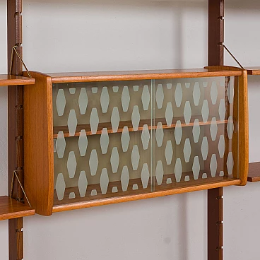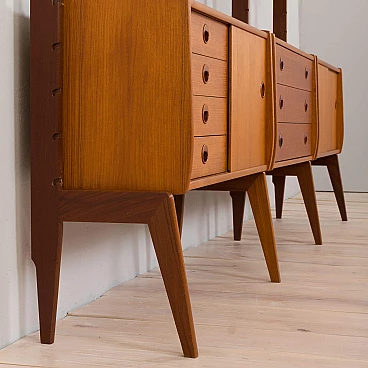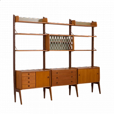A modern, Scandinavian teak wall unit with the three-bay modular shelving system Ergo, designed by John Texmon and Einar Blindheim for Blindheim Mobelfabrikk and made in Norway in the 1960s. The slightly curved sides give a warm impression and the sculptural rails create an elegant and grandiose image.