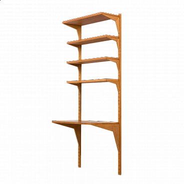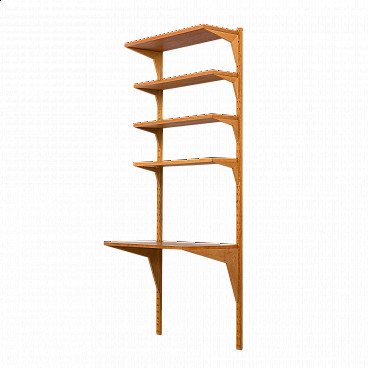 Danish oak wall cabinet with desk designed by Poul Cadovius in the 1960s. It can perfectly create a discreet work space in the living room. The cabinet consists of three 22 cm deep shelves; one 30 cm deep shelf; one 46 cm deep shelf; two 203 cm long wooden rails; ten solid wood supports. All elements are 80 cm wide and can be arranged as desired. The set is in excellent vintage condition with slight traces of use.