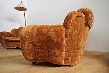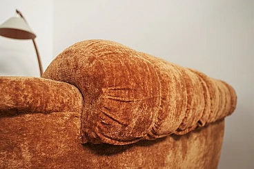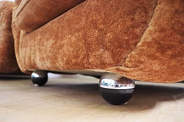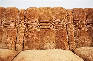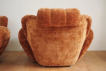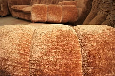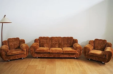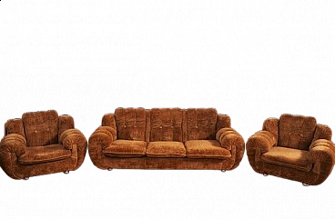 Pair of brown velvet armchairs and sofa, 1970s. The sofa is 80 cm high, 220 cm long and 100 cm deep. The armchairs are 80 cm high, 110 cm wide and 105 cm deep.