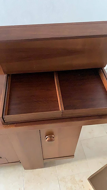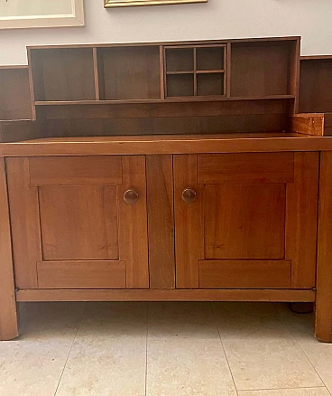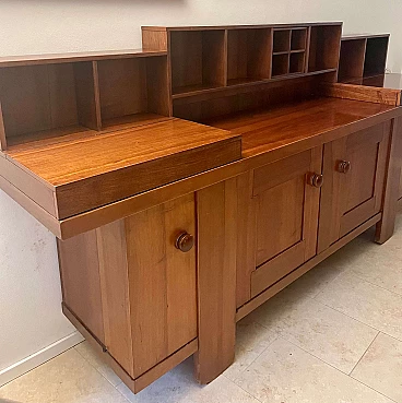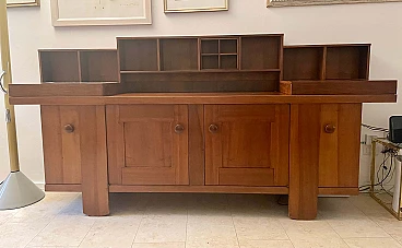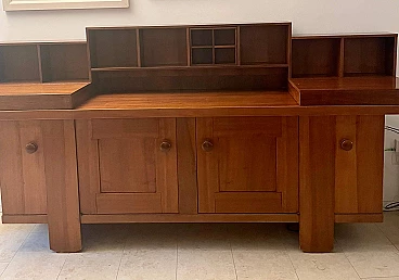 Sideboard with risers manufactured by Bernini designed by Silvio Coppola in 1968. Flamed' model, considered the luxury model. The structure is made of walnut feather veneer. In the front elevation there are eight identical compartments, one of which is divided into four to hold white ceramic spice containers, at the sides two openable compartments containing a removable cutlery compartment and two trays. The four-door lower part has two central doors, two corner doors and adjustable interior shelves. Walnut flames are positioned on the doors as well as in the riser compartments and on the inside.
