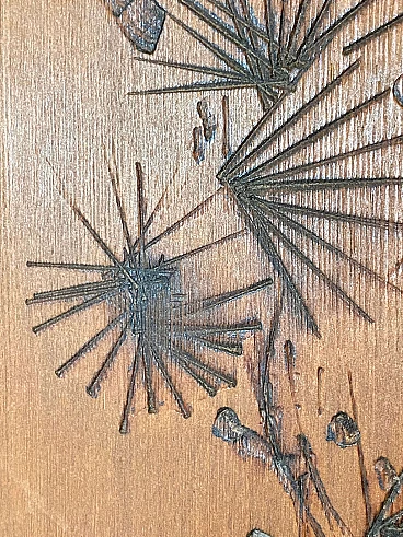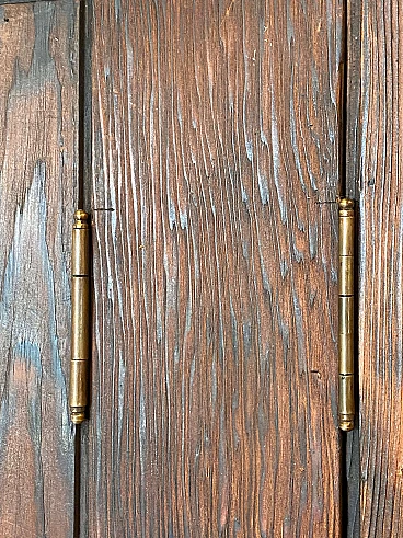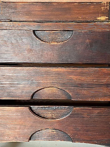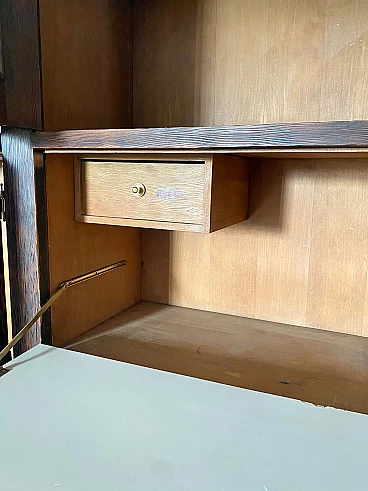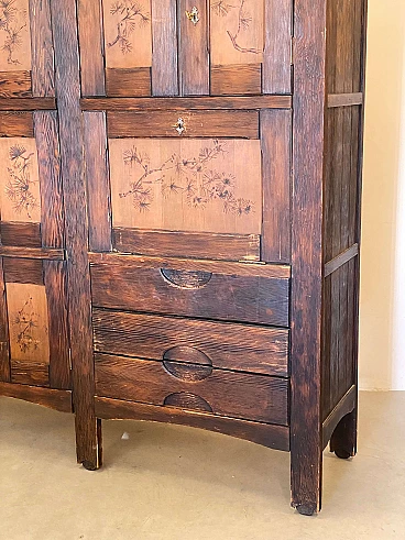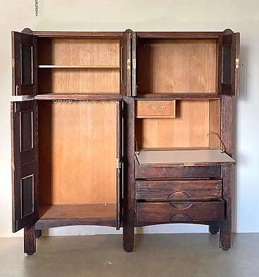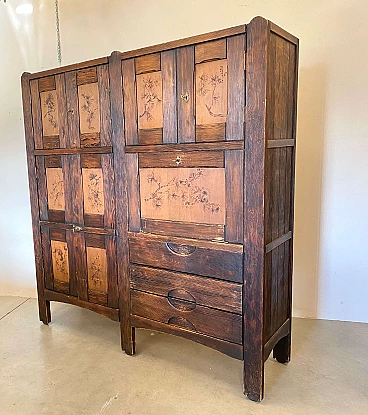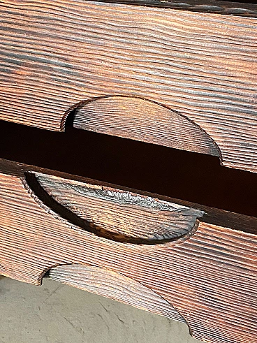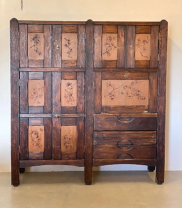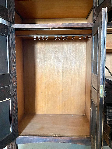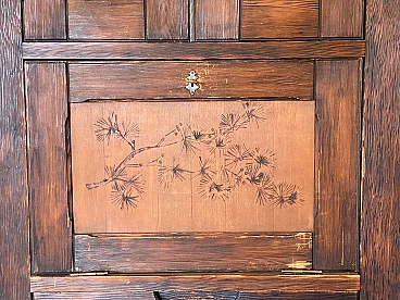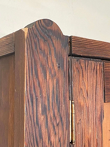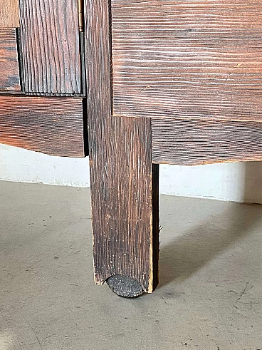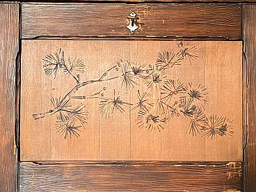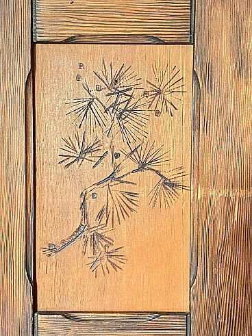 1960s sideboard designed by Victor Cerrato for a house in Sestriere in the Piedmontese Alps in the 1960s, in pine wood, made up of two tall compartments with shelves, a small wardrobe, a compartment that serves as a desk and three drawers, the they are decorated with the pyrography technique
