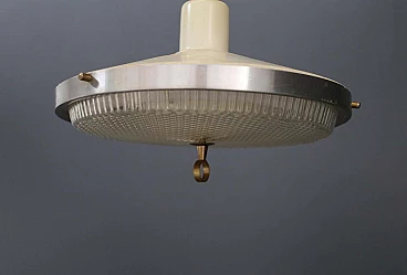 Eccentric up-and-down lamp of 1950s vintage design. The pendant is also called saliscendi because of its counterweight mechanism that allows the lamp to rise and fall at will. The chandelier comes from Italian administrative offices. The lamp is supported by a canvas cable that acts mainly as a regulator thanks to the aluminium and brass counterweight. Its diffuser is made of painted conical aluminium, while the ceiling cover is made of worked glass. Note its brass elements, especially the ring in the centre of the ceiling light. It is certainly not just a decorative element, but as its first function it has the use of a socket for adjusting the suspension. The rope is slightly worn due to its use. The lamp is in good condition and in working order.