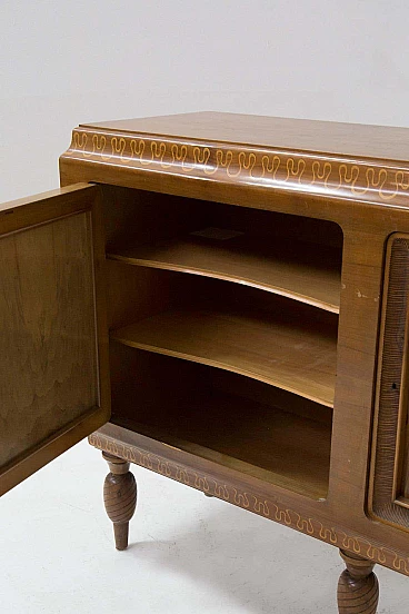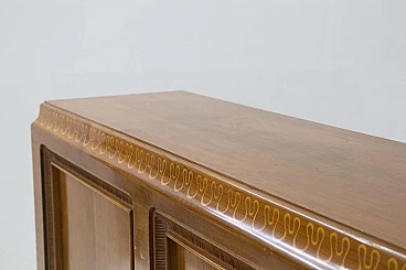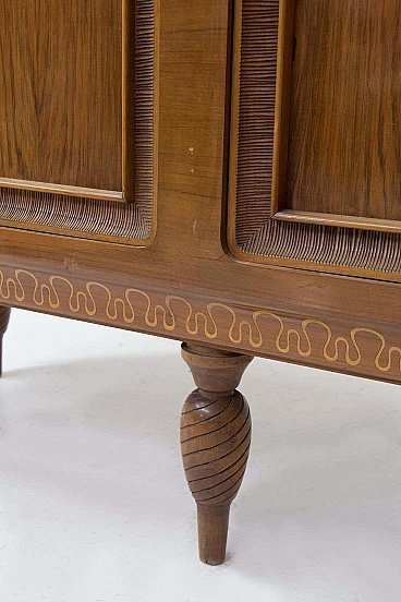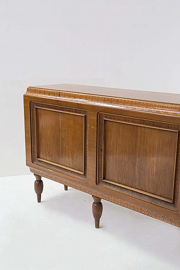 Splendid sideboard designed in the 1950s for the famous Valzania production with original label. The sideboard is entirely made of solid walnut wood decorated and carved with elegant ornaments and gold decorations. The legs that support the structure are four and have a very sinuous shape in fact the foot ends in a cylindrical element, but centrally each leg sees an oval wooden decoration, which gives it more elegance and pomposity. The central body consists of three large central wooden doors. On the side doors are elegant wooden shelves. Around each door is a beautiful and elegant frame. The top is polished and smooth, perfect for displaying and placing design elements. The sideboard is suitable for vintage and mid-century interiors.