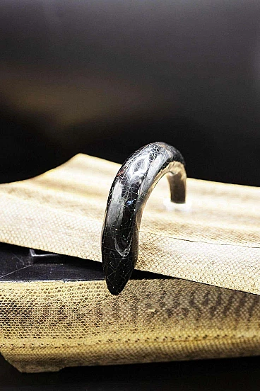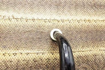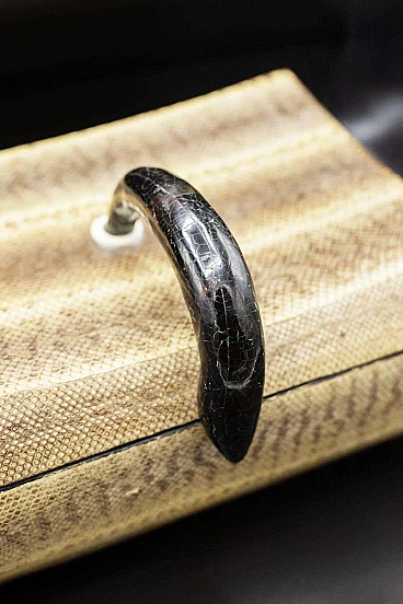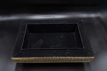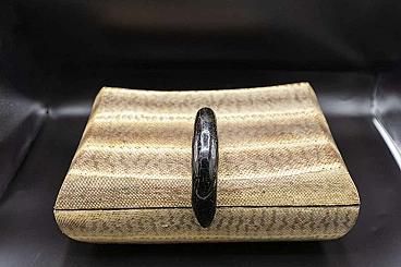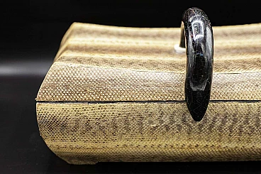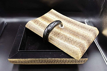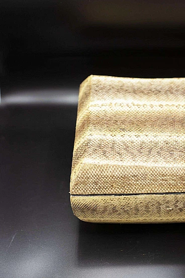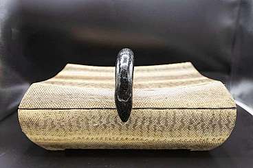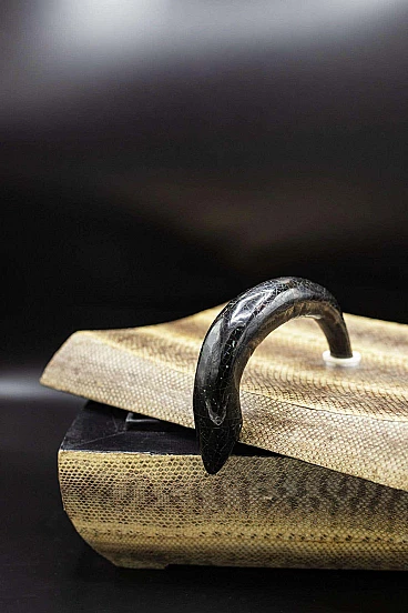 Beautiful and rare Art Deco jewellery box of fine French manufacture. The jewellery box has a fairly large rectangular shape and is created from two parts, the base which is the actual container and its lid. It is made entirely of imitation leather in shades of brown, which is very elegant. There is a dark hooked handle through which the box can be opened. The interlocking interior is made entirely of black velvet, very elegant and suitable for jewellery. The jewellery box is suitable for whimsical people like him.