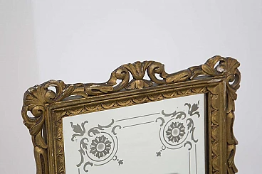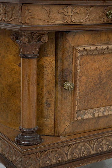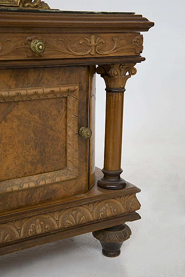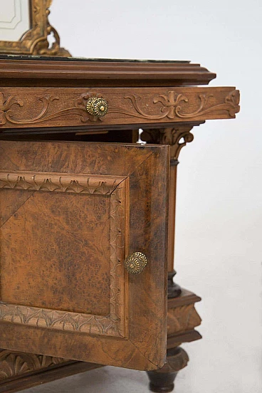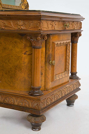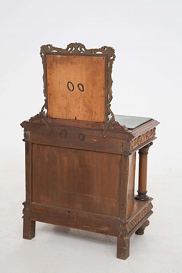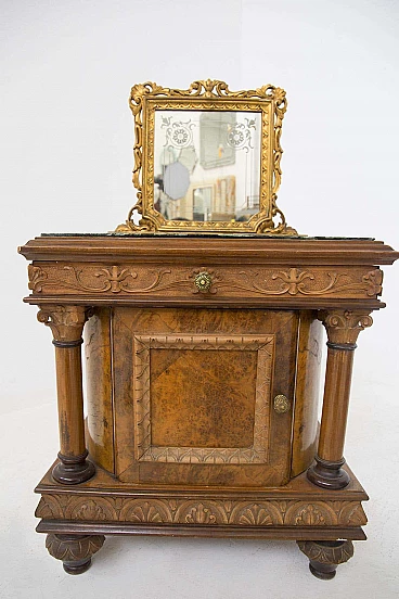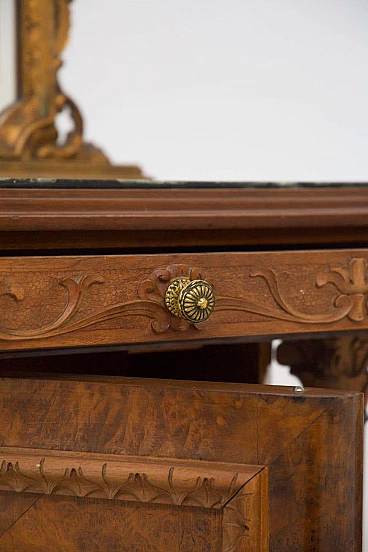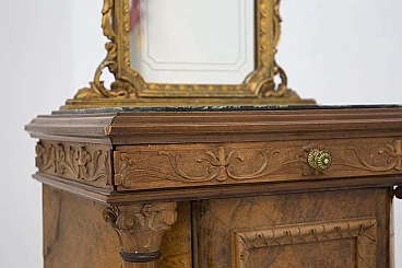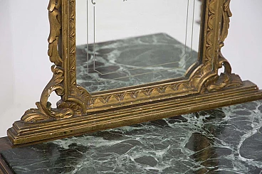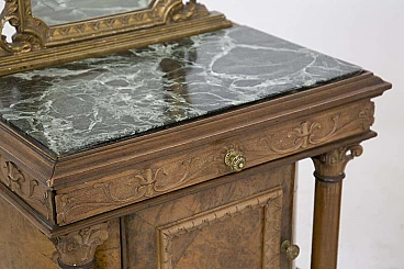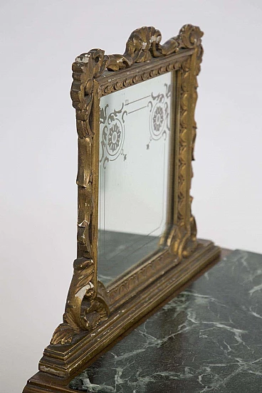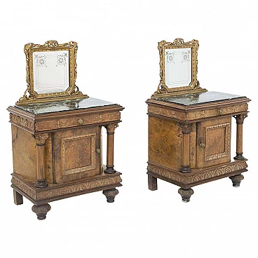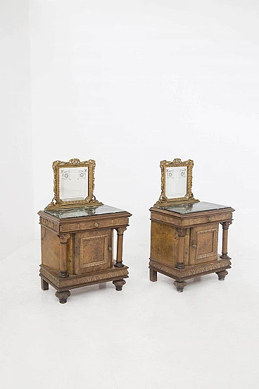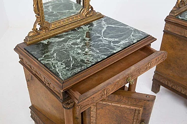 Splendid pair of bedside tables in wood and marble made at the beginning of the 20th century of fine Italian manufacture. The bedside tables have an all-wood structure with soft, rounded shapes, which lend them a pompous aura. The base consists of four rounded, thick wooden feet that make the piece of furniture much more stable. The central body houses a larger door, surmounted by a small drawer with a gilded wooden knob. The top is supported by two columns, also made of wood, making it more elegant. The bedside table top is made of Alpi green marble, a timeless beauty. The top also houses a base that supports the gilded wooden frame that frames the mirror. The mirror is decorated on all corners. The frame features finely worked twentieth-century style squiggles. The bedside tables are ideal for completing very important bedrooms.