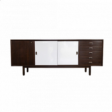 Fully restored 1960s rosewood sideboard with 1 opening door, 2 sliding doors covered in white Formica and drawers. Wooden handles with aluminium details.