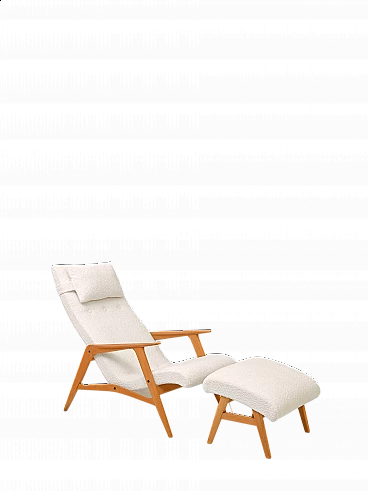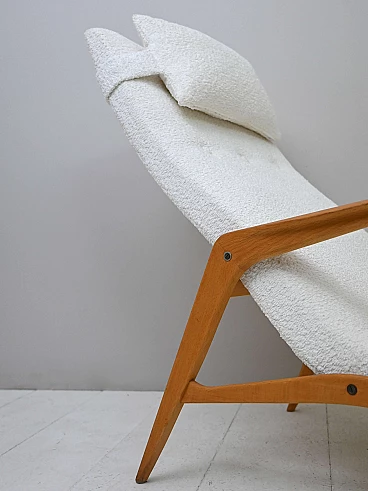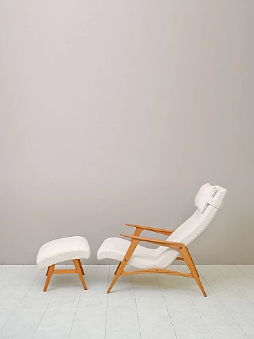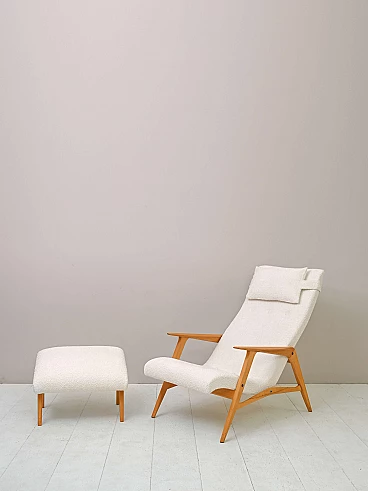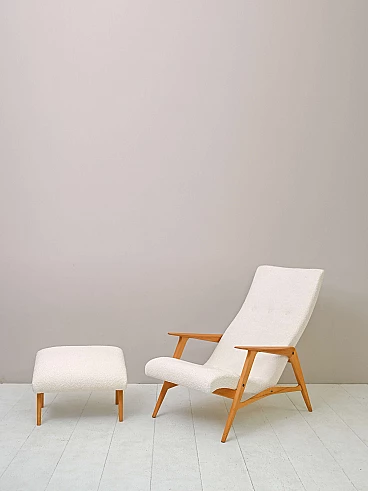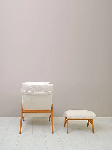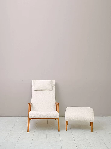 Original Scandinavian 1960s armchair with bouclé fabric. A unique piece of furniture with timeless beauty, this chair also has its own stool original. The frame is made of oak wood and the upholstered seat has been covered with boulcé fabric white. This undeniably elegant armchair is perfect for adding a Scandinavian touch to a room. Good condition. Has been restored.
