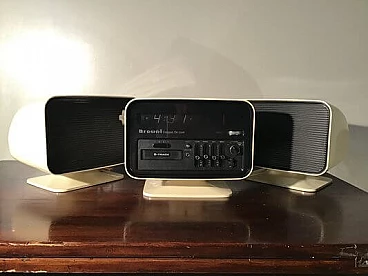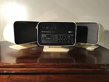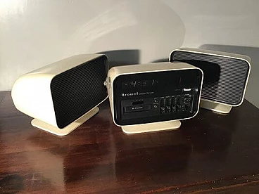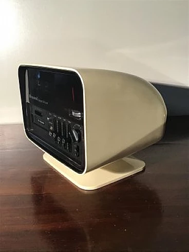Consists of a central body and two separate speakers, a radio with electro-mechanical clock-wake system and Stereo 8 cassette player. Transistorised, integrated circuits amplifier section. Net weight 5.2 kg.