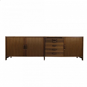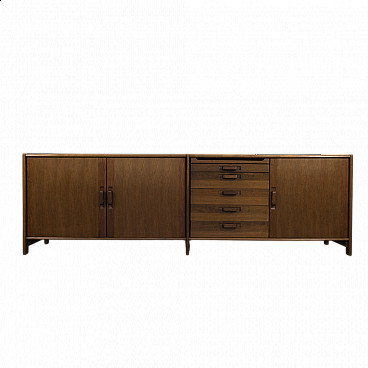 Large walnut sideboard manufactured by Giuseppe Rossi of Albizzate in the 1960s. Consisting of double door with internal wooden shelving, drawer unit with pull-out tray and single door also with wooden shelving.